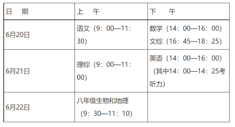 湖北随州中考时间2024年时间表(6月20日-22日)