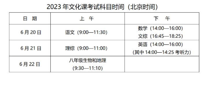 日期上午下午6月20日语文(9:00—11:30)数学(14:00—16:00)文综(16:45—18:25)6月21日理综(9:00—11:00)英语(14:00—16:00)(其中14:00—14:25考听力)...2017-04-19