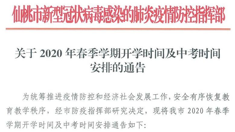 仙桃市新型冠状病毒感染的肺炎疫情防控指挥部发布《关于2020年春季学期开学时间及中考时间安排的通告》,公布初三年级开学时间及中考时间安排。为统筹推进疫情防控和经济社会发展工作,安全有序...2020-07-01