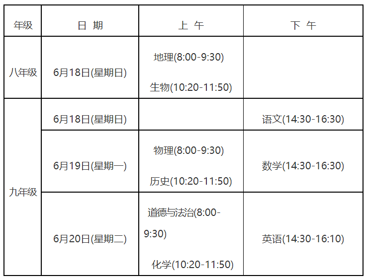 湖南湘潭中考时间2023年时间表(6月18日-20日)