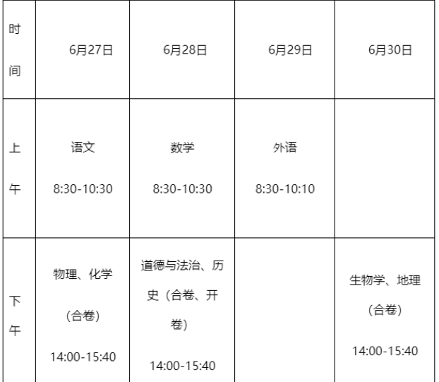 吉林中考时间2024年时间表(6月27日-30日)