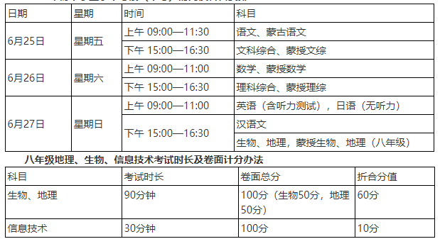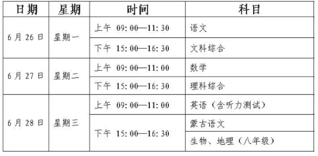 内蒙古中考时间2024年时间表(6月26日-28日)