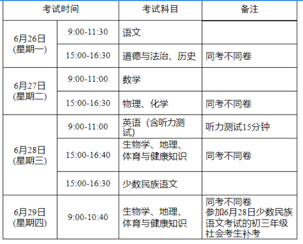 内蒙古中考时间2024年时间表(6月26日-28日)
